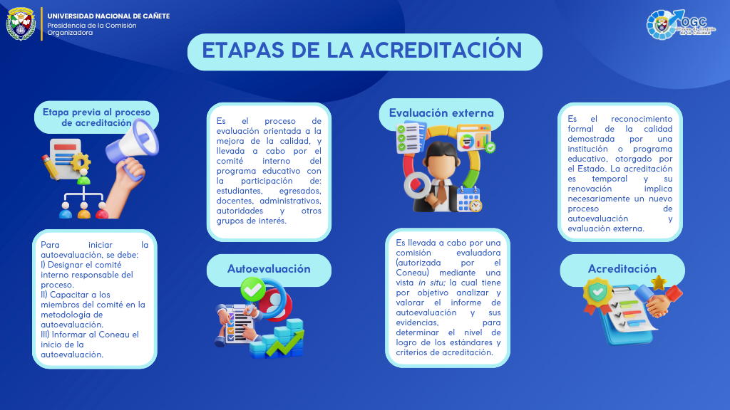 El Sistema Nacional de Evaluación, Acreditación y Certificación de la Calidad Educativa (SINEACE) señala que la acreditación es el reconocimiento público y temporal a la institución educativa, área, programa o carrera profesional que voluntariamente ha participado en un proceso de evaluación de su gestión pedagógica, institucional y administrativa.